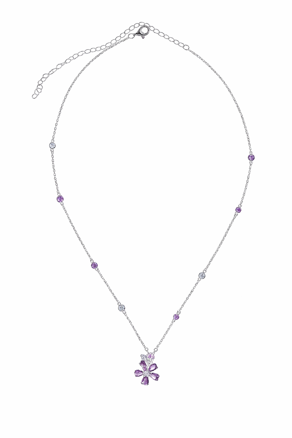 - Crafted with precision and passion, this pendant features a stunning array of White, Amethyst and Rose Pink Cubic Zirconia stones, elegantly set in radiant 925 sterling silver with 16inch + 4 inch extension chain.