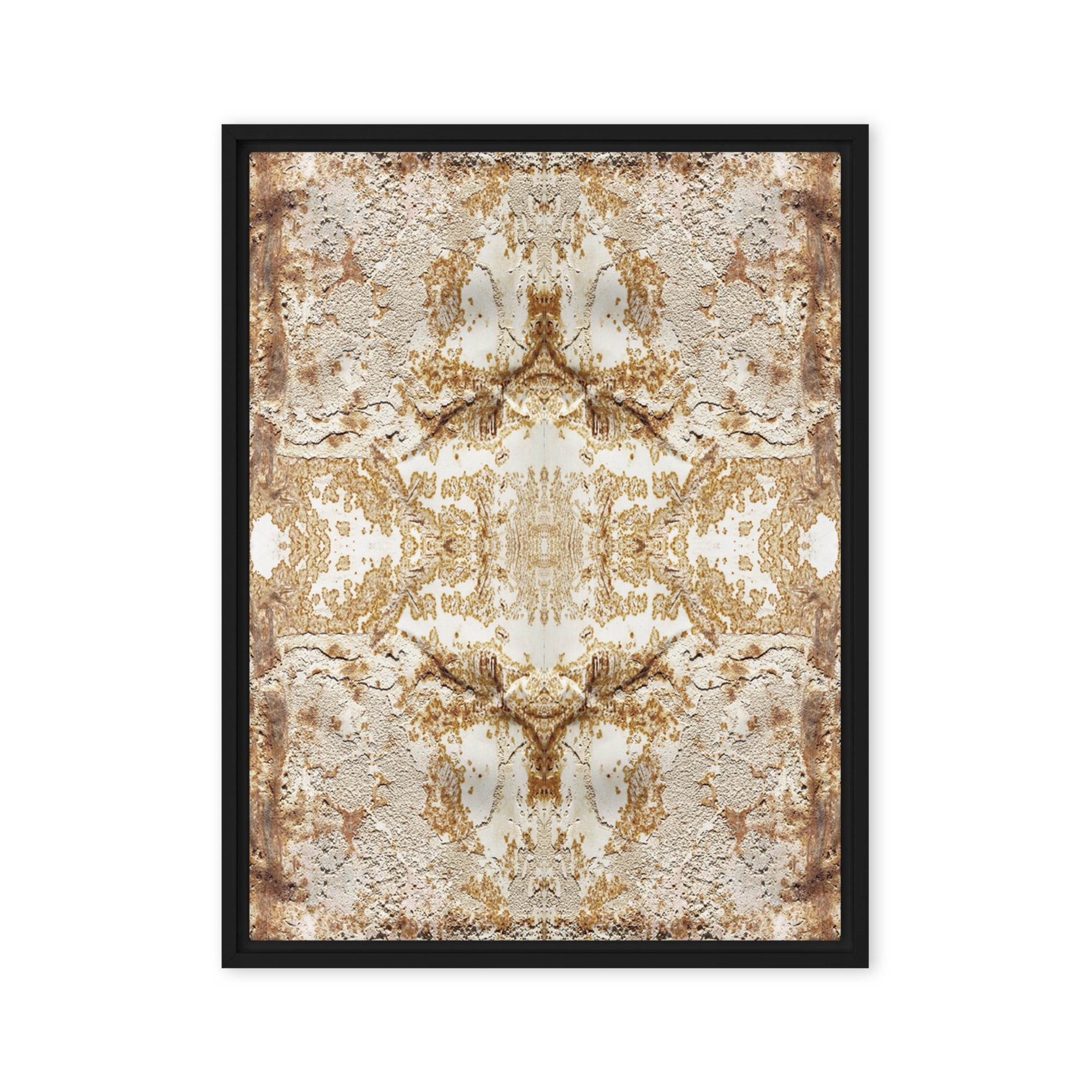 The color palette shifts the whole mood into something antique and weathered: creamy off-whites layered with rust, sand, and golden-brown staining, like oxidation or mineral seepage. In the center, the mirrored marks form a medallion-like focal point with a subtle totem / mask impression, while the surrounding textures feel like old masonry, parchment, or patinaed metal.