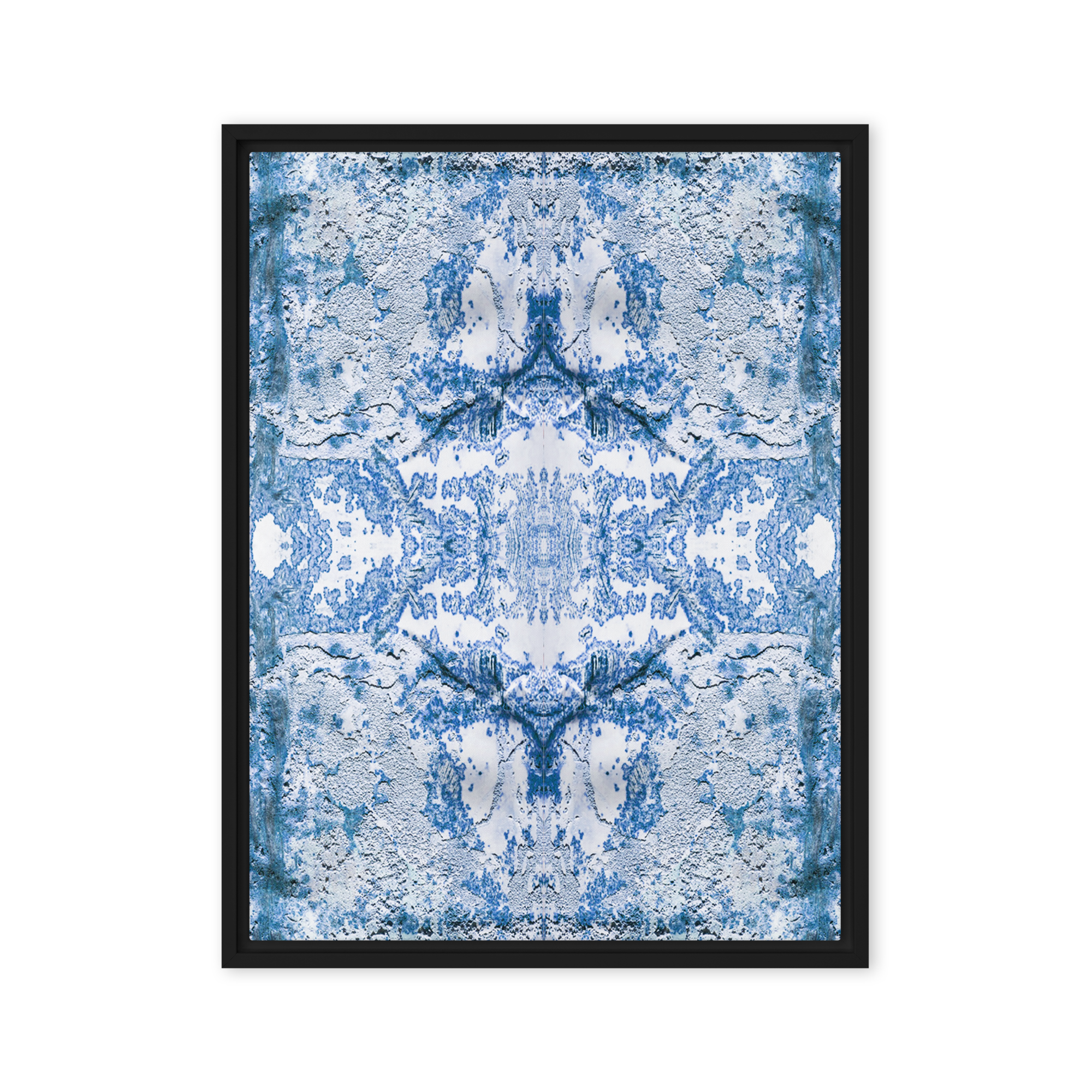The palette shifts the mood into something icy and atmospheric—soft whites and pale grays are washed with cobalt and denim blues, as if pigment seeped into stone. In the center, darker blue marks form a totem-like spine, while delicate, lacey details radiate outward into a tapestry-style medallion. The edges stay rough and grainy, framing the composition with a natural, almost coastal “salt-and-stone” grit.